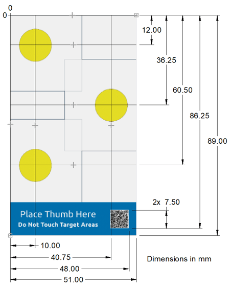 - Be aware that the position of the yellow circles can vary due to tolerances of the card and holder. It is best not to measure too close to the edge of the circle.