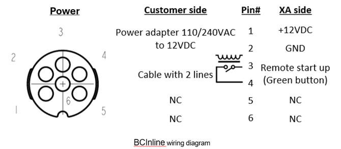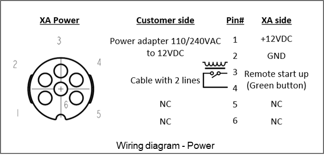 If you want to control the green multipurpose button remotely (for remote start-up, for example), wire a dry contact into the remote switch activation cable (pre-wired with the AC adapter). Close the contact for 0.5 seconds for remote start-up.
