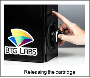 - The following message appears on the touchscreen: "Please remove the old cartridge by pressing the release button and pressing forward to unlock it". Remove the cartridge by pushing down on it while pressing the release button as shown below.