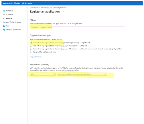 Instructions for how to enable Single Sign On(SSO) with BrightonID and Azure Active Directory to enable login to Brighton Customer Hub and other services
