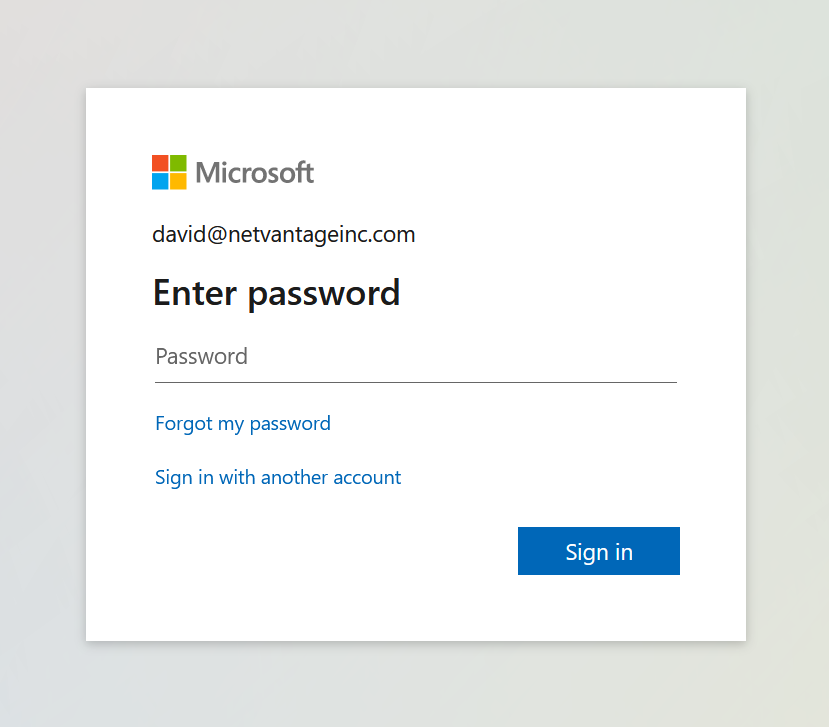 - After setup is complete, your users will see our standard login page. After entering their e-mail the page remove the password: